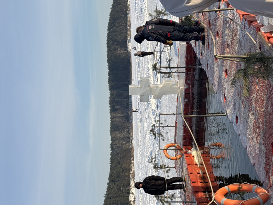A winter outdoor scene depicts an ice-covered lake or river prepared for a cold water immersion event in Падлабенскі сельскі Савет, Belarus, under a clear blue sky. A large, ornate Orthodox cross, sculpted from ice, stands prominently on a floating pontoon platform. The platform, constructed from red and white sections and partially covered in ice and snow, encloses a rectangular section of open, dark water. Two orange lifebuoys are affixed to the platform's railings, which are decorated with small evergreen branches. To the left of the open water, a man dressed in a dark hooded winter jacket and pants stands, observing the scene. To the right, two individuals in dark blue winter overalls, marked with patches, stand near the ice cross, appearing to be safety personnel. In the background, several indistinct figures are visible on the vast expanse of snow-covered ice, with a dense forest of coniferous and deciduous trees marking the distant shoreline.