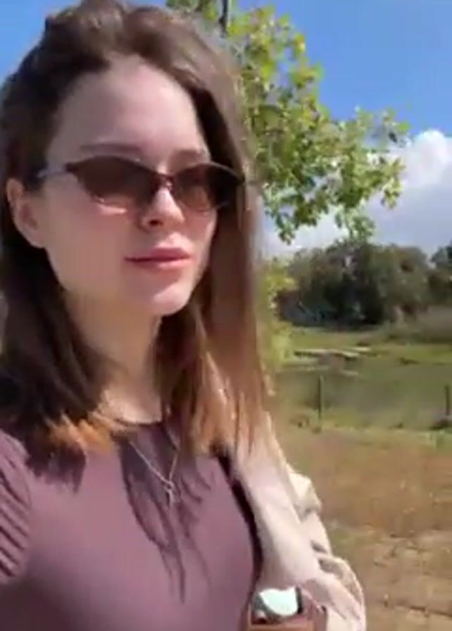 A woman is walking outside on a sunny day. She is wearing sunglasses, a brown top, and a tan sweater draped over her shoulders. She has shoulder-length brown hair. She is carrying a brown bag in her left hand. The background consists of trees, grass, a small body of water, and a bright blue sky with a few clouds. She is looking directly at the camera as she walks and smiles occasionally. She appears to be recording herself with a handheld device. The ground is dry and dusty. A few buildings are visible in the distance.