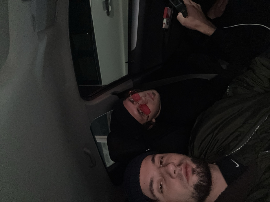 Two men lie in what appears to be the back of a car. One man, wearing a beanie and with a beard, is closest to the camera. Above him, another man wears red sunglasses and a black head covering. An arm holding a phone and a cigarette case is visible near the top of the frame. The interior of the vehicle is dimly lit, with a gray interior panel visible.