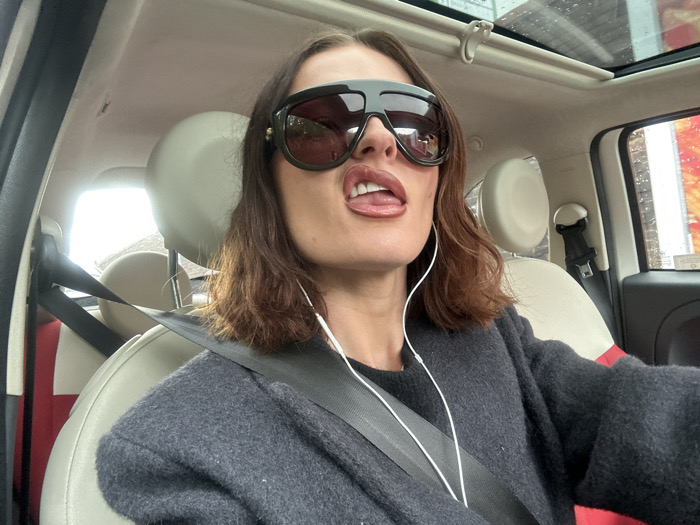 The image depicts a female individual in the driver's seat of a white Fiat 500 vehicle, located in Tunbridge Wells, United Kingdom. She has brown, shoulder-length hair and is wearing large, dark, aviator-style sunglasses. Her mouth is open, with her tongue partially extended and lips coated in a dark reddish-brown lipstick. White wired earbuds are visible, with one earpiece positioned in her left ear. She is dressed in an oversized dark grey or black sweater or coat, with a red element visible on her right side, possibly an undergarment or lining. A black seatbelt is fastened across her chest. The vehicle's interior includes light-colored seats and a panoramic glass sunroof, which exhibits condensation or rain droplets on its exterior surface. Through the wet passenger-side window, a distinct vertical orange and white striped structure is visible, consistent with the signage or exterior of a commercial establishment, such as a drive-through restaurant or petrol station.