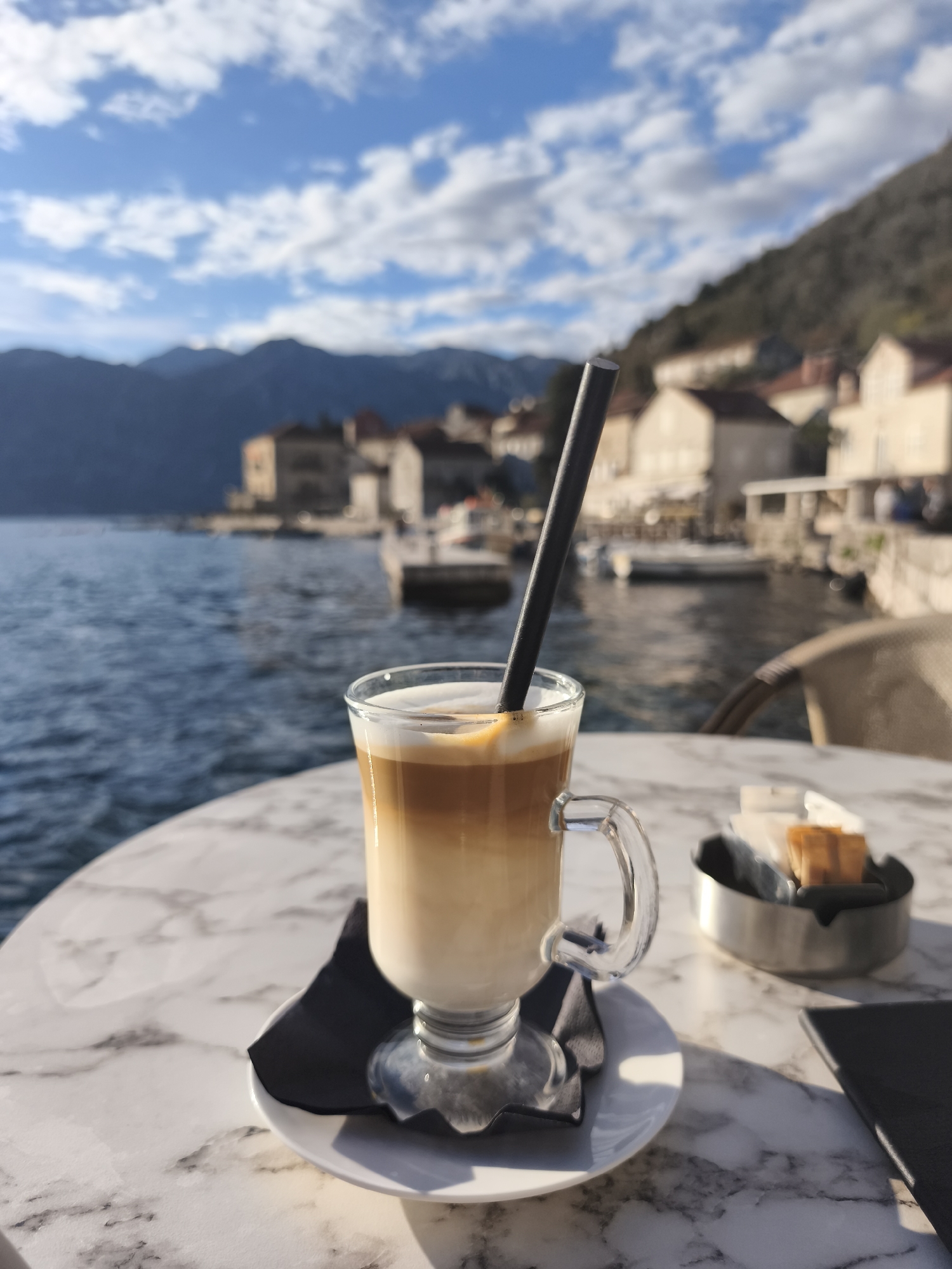 The image captures a glass of layered coffee on a marble table, placed on a white saucer atop a black napkin. A black straw is inserted into the drink. Next to the coffee is a small, silver-colored dish containing what appears to be sugar packets and small, rectangular wafers. The background reveals a waterfront scene with buildings that suggest the location is in Perast, Montenegro. The sea is calm, and there are buildings with light-colored stone facades visible, along with docks and boats. In the distance, mountains are visible under a blue sky with scattered clouds. The scene suggests a cafe setting.