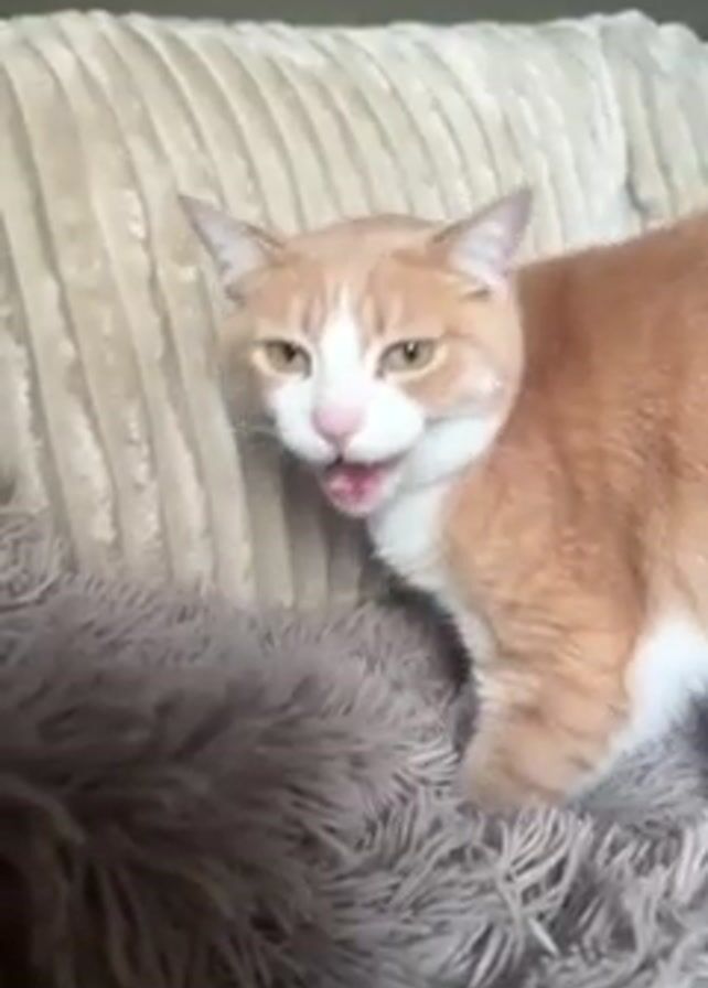 A fluffy grey blanket is in front of a beige couch. An orange and white cat with yellow eyes is standing on the blanket. The cat looks up when someone says "Shanks", meows, and then sniffs the back of the couch.