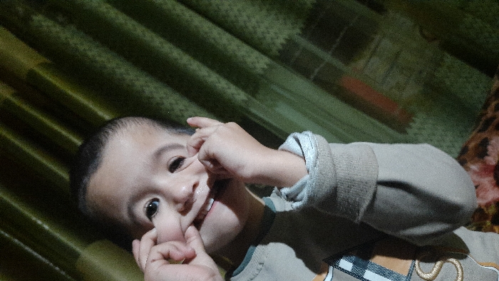 A young child is depicted in an indoor setting, visible from the upper torso upwards. The child is performing a facial gesture, using their index fingers to pull down the skin below their eyes and their thumbs to pull up the corners of their mouth, forming a wide smile. Their eyes are open and directed towards the camera. The child wears a light tan long-sleeved shirt with ribbed cuffs. A white and brown checkered pattern is visible on the viewer's left chest area, along with a golden 'S' embroidered beneath it. The background consists of dark olive-green, vertically ribbed panels, likely a wall covering. A fragment of a patterned, possibly animal print, fabric is visible in the lower right foreground. The lighting is low. The specific location within Limbur, Uzbekistan, cannot be confirmed by the visual evidence.