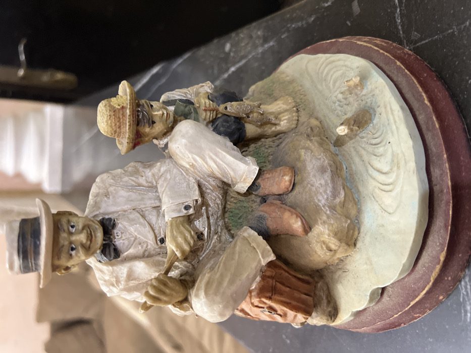 A sculpture depicts two men in formal attire, one in a straw hat and the other in a top hat with a bow tie, relaxing by a stream with fish. The man in the top hat is seated, holding a cane, with a small suitcase beside him. The other man leans back, holding a string of small fish. The figures are resting on a base that resembles a riverbank with water. The sculpture is mounted on a round, wooden base.