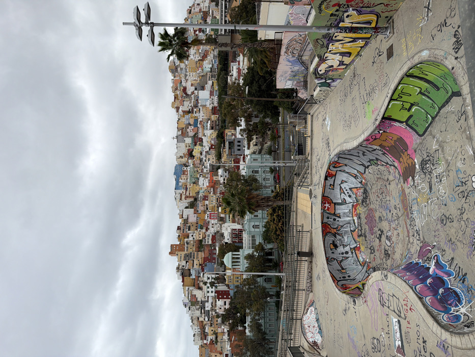 The image displays an urban scene in Las Palmas, Spain. The foreground features a concrete skatepark composed of multiple bowls and ramps, entirely covered in layered graffiti tags and stylized lettering in various colors including black, white, grey, red, pink, green, yellow, and purple. A tall grey streetlight with four square luminaires is positioned on the right. Concrete pathways and metal railings delineate the skatepark area. In the midground, beyond the skatepark, a street or plaza area is visible with faint indications of vehicles and multiple large palm trees. A prominent light blue building complex with a central dome structure stands among other greenery. The background is dominated by a steep hillside densely packed with numerous multi-story residential buildings. These structures are painted in a wide palette of vibrant colors, including orange, red, yellow, pink, blue, green, and white. A cross-shaped structure is identifiable near the highest point of the hill. The sky is uniformly overcast with grey clouds. No individuals are present in the scene.
