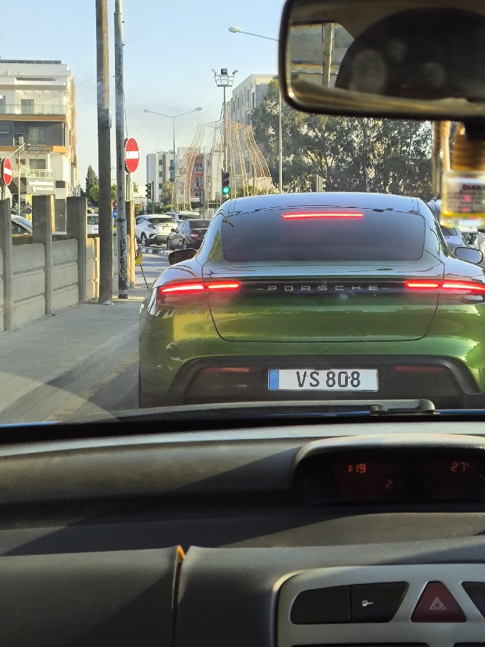 The image presents a forward-facing view from inside a stationary vehicle, capturing a street scene in Gonyeli, Northern Cyprus. In the immediate foreground, the observer's vehicle dashboard is visible, featuring a digital display showing "119" and "27" (likely time and temperature) and a hazard light button. A small, amber-colored hanging air freshener or charm dangles from the rearview mirror, which partially reflects an interior ceiling. The central subject is a metallic green, possibly chameleon-painted, Porsche Taycan sedan directly in front, displaying a Northern Cyprus license plate "VS 808". Its full-width rear LED taillight strip and lower brake lights are illuminated red, indicating it is stopped or braking. The word "PORSCHE" is emblazoned across its rear. To the left of the road, a sidewalk is bordered by low, grey concrete barriers. A utility pole stands on the sidewalk, bearing a red circular 'No Entry' sign, with another identical sign visible further down the street. Overhead wires are suspended from the poles. In the mid-ground, a green traffic light is illuminated for the observer's direction of travel. The background features multiple modern, multi-story buildings, typical of urban development, lining both sides of the street. A distinctive large, abstract, skeletal metal structure, resembling an archway or decorative installation, stands prominently at a distance, identifying the location as the **Gönyeli Roundabout (Gönyeli Çemberi)** in Gonyeli. Other vehicles, including a white SUV, are visible in the traffic lane ahead of the Porsche. The sky is clear and bright, consistent with daytime conditions.