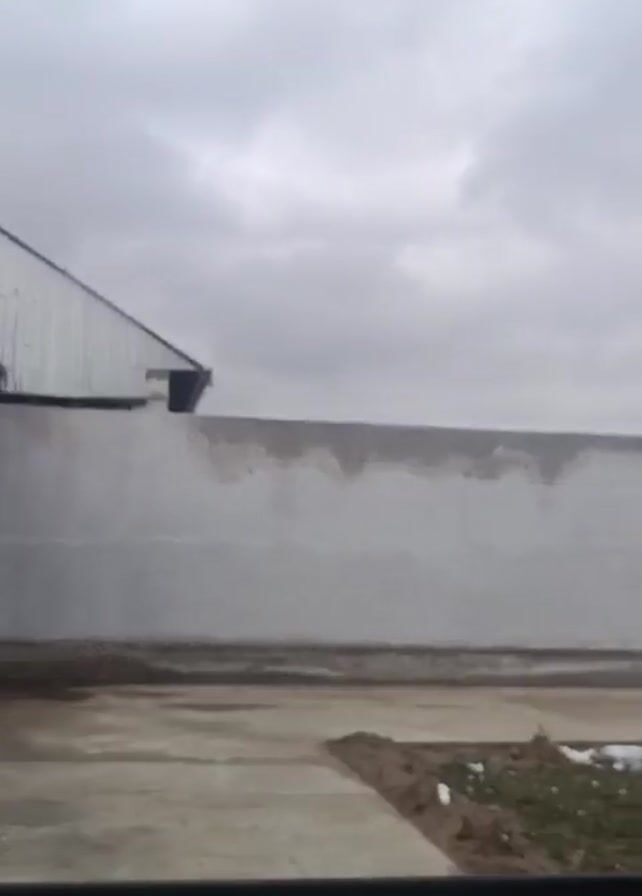 view from a balcony or porch, looking out at a walled-in yard under a cloudy sky. The wall is made of concrete and has dark patches or stains on it. There is a building to the left with a corrugated metal roof. The ground is mostly concrete, with some patches of dirt and some small piles of snow. A dark, wrought-iron railing is visible at the bottom of the frame. The camera starts out focused on the scene and then goes slightly out of focus.