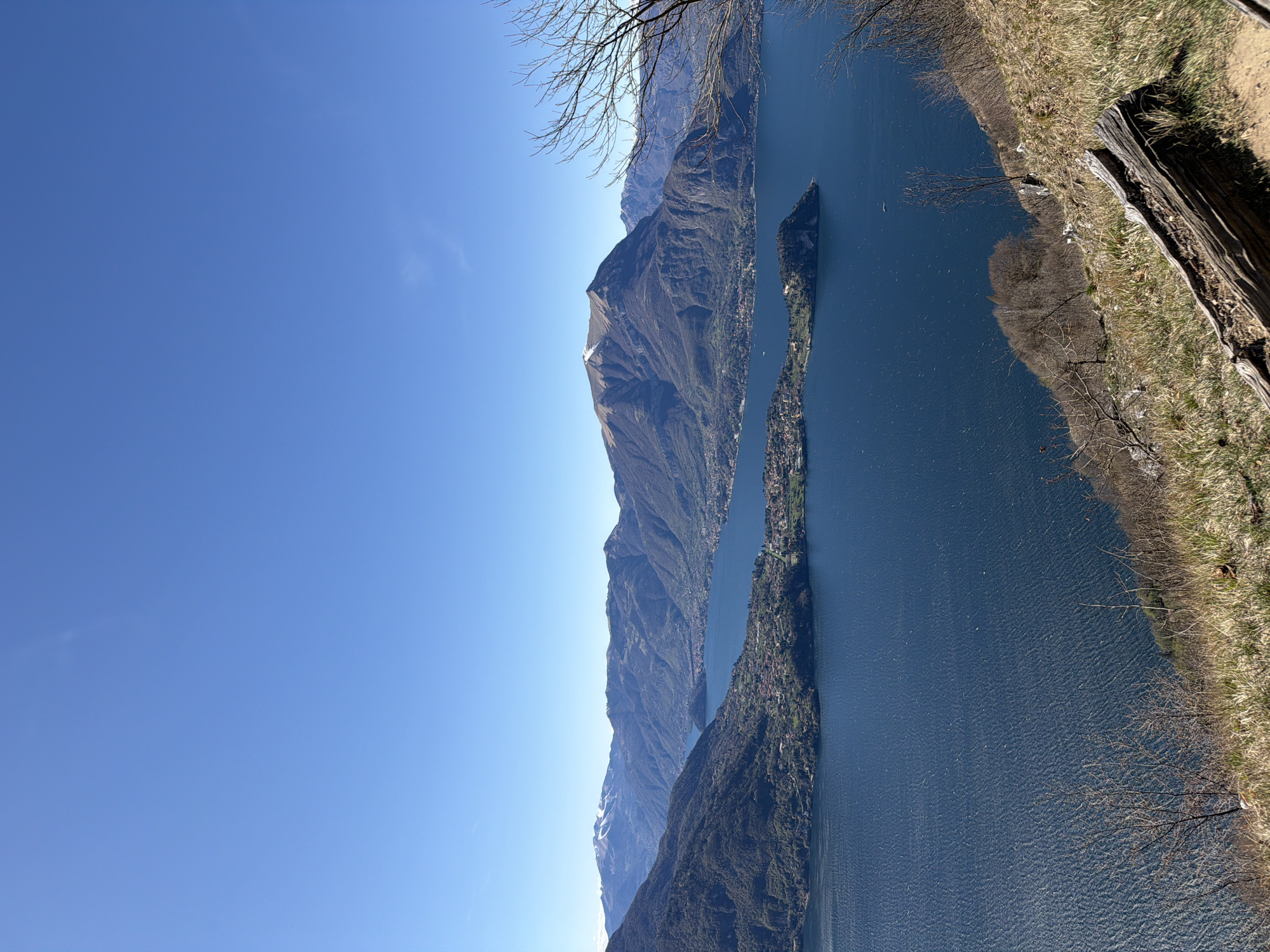 The image presents a landscape view, oriented sideways, featuring a body of water nestled between mountainous terrains. The water is a deep blue, suggesting either considerable depth or a reflection of the sky. Mountains rise on both sides of the water, with the left side showcasing more gradual, vegetated slopes and the right side exhibiting steeper, rockier faces with some snow patches. Small villages or settlements are visible along the edges of the water where the terrain allows. In the foreground on the right, there's a close-up view of ground cover with dry grass and what appears to be a weathered log or a piece of wood. This gives the impression of the shot being taken from a higher vantage point, possibly a hillside or a cliff edge. The sky above is clear and blue, with no visible clouds, which enhances the overall clarity and sharpness of the landscape. Based on the geography and architectural styles visible in the settlements, this could be the town of Lierna, Italy, located on the eastern shore of Lake Como. The image likely captures the unique landscape of the lake and its surrounding mountains.