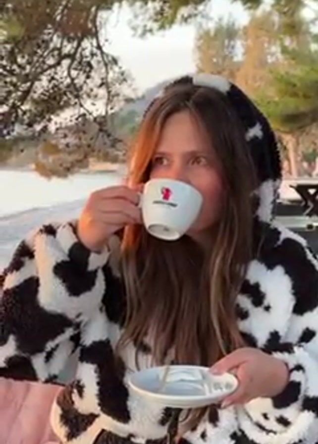 A young woman with long hair, wearing a black and white cow-patterned hooded sweatshirt, is seated at a table on a beach, drinking from a white espresso cup