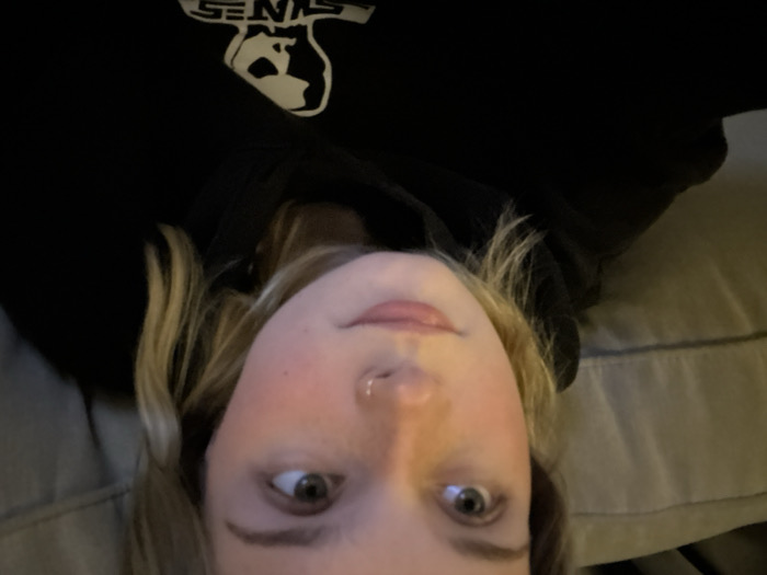 A person with blonde hair lies on a gray pillow, looking directly at the camera with slightly widened eyes. They are wearing a black hooded sweatshirt. A portion of the sweatshirt's logo is visible, featuring a graphic with the letters "SENS" above a figure of a person or animal. The lighting is dim, and the camera angle is close-up and slightly tilted.