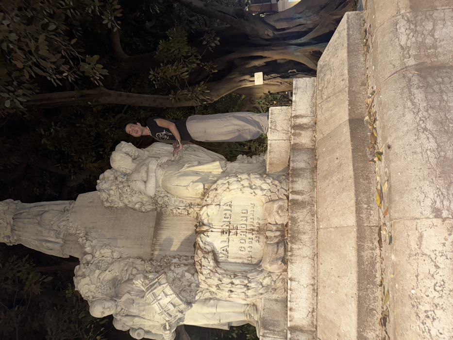 This nighttime image features a single male individual standing on a stone monument in the Plaza de la Virgen, Valencia, Spain. The monument is the Monumento a la Mare de Déu dels Desemparats. The male, an adult, wears a black sleeveless t-shirt with a white graphic and light grey baggy trousers. He has short dark hair and a necklace. His head is tilted upwards, and his hands are held open, palms facing up, in front of his abdomen. He stands on the first raised tier of the monument, positioned to the right of its central structure. The monument, constructed from light-colored stone, displays weathering. Its base comprises multiple rectangular tiers. The mid-section features carved figures: a male figure holding a drum on the left, and a group of female figures on the right, near where the individual stands. Centrally located on this section is a carved wreath surrounding the inscription: "VALENCIA LE CORONO EL 14 DE NOVIEMBRE DE 1909." The upper portion of the monument, featuring additional figures, is partially obscured by darkness and perspective. Artificial lighting illuminates the monument and the individual, contrasting with the darker background. Behind the monument, a large, mature tree with a thick trunk and dense foliage is visible. The ground immediately surrounding the monument's base is paved and has scattered dry leaves. Distant urban lighting is faintly discernible through the trees in the far background.