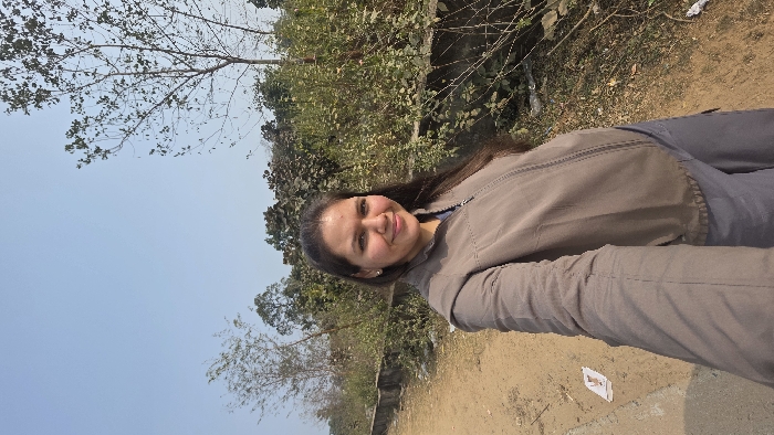 A woman in a brown jacket and grey pants stands outdoors, smiling at the camera. Behind her, there's a wall with greenery, and trees frame the blue sky above. The ground is dirt or gravel, and some paper trash is visible near the bottom right corner.