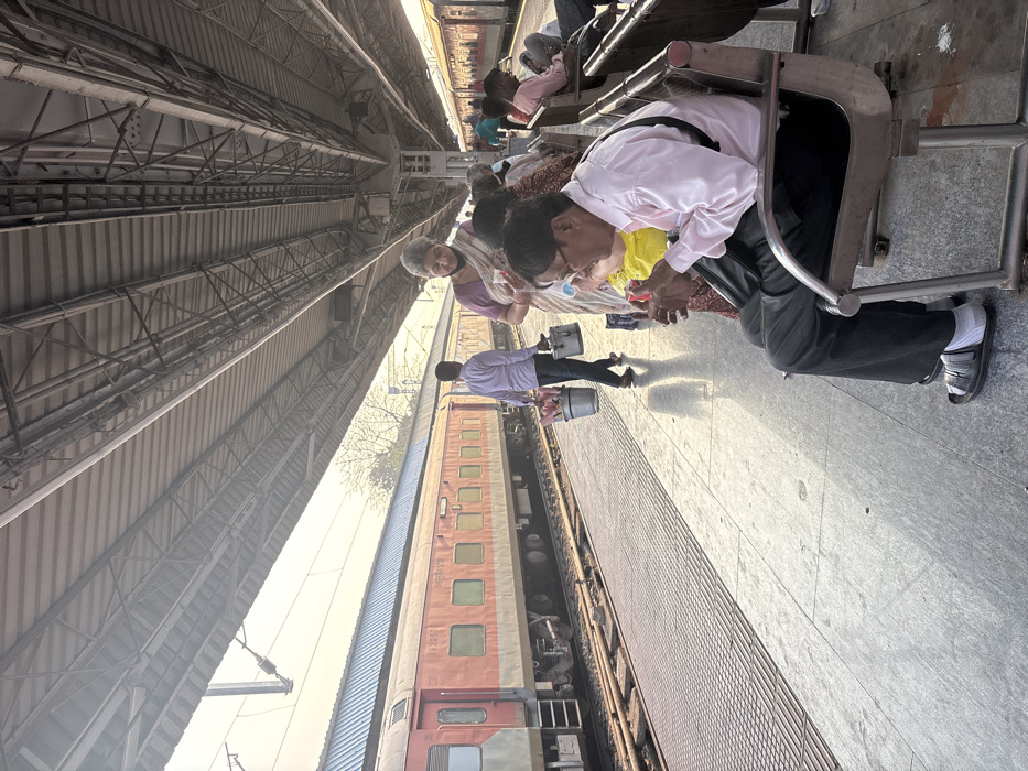 The image depicts a railway station platform in Kolkata, India. A red and light grey passenger train, identified by "162057" and 'भारतीय रेल' (Indian Rail) along with Bengali script on its side, is stationary on the tracks to the left. The platform is covered by an extensive metal-trussed roof structure. In the foreground, an adult male is seated on a metal bench, wearing a light pink long-sleeved shirt, dark trousers, white socks, and dark sandals. He holds a small white object to his mouth. Standing next to him is an older adult female in a patterned sari, with a black face mask positioned below her chin, holding a small white cup. An adult male vendor, dressed in a light purple shirt, walks between these individuals and the train, carrying two metal buckets suspended from a pole across his shoulder. Other passengers are partially visible seated further down the platform to the right. The scene is brightly lit by natural sunlight, casting discernible shadows on the platform's grey tiled surface. Overhead electric lines and support structures are visible above the tracks.
