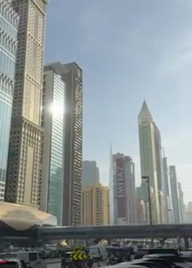The camera pans upwards across a cityscape. Numerous high-rise buildings are visible against a bright blue sky. Traffic fills the street, with several cars, vans, and taxis present. A pedestrian walkway crosses above the street. One building displays a large “IMTIAZ” sign. The sun reflects off the glass windows of a building.