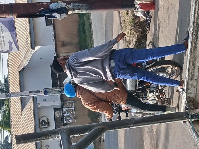 Two individuals are seen on a motorcycle. The driver, wearing a blue helmet and brown jacket, is seated. Behind him stands a second person in a grey hoodie, blue jeans, and a black hat. The motorcycle is positioned on a street. In the background, there's a building, vegetation, and a sign. The scene is captured in daylight.