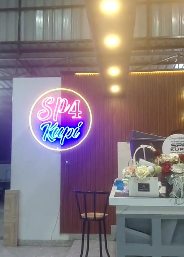 The camera pans across the interior of SP4 Kupi, a coffee shop, showing the front counter and the barista at work. The shop has a high, corrugated metal roof with pendant lighting. A neon sign reading “SP4 Kupi” is fixed to the wall to the left of the counter. The counter is decorated with floral arrangements. A young person in a black shirt and white pants stands to the right of the counter.