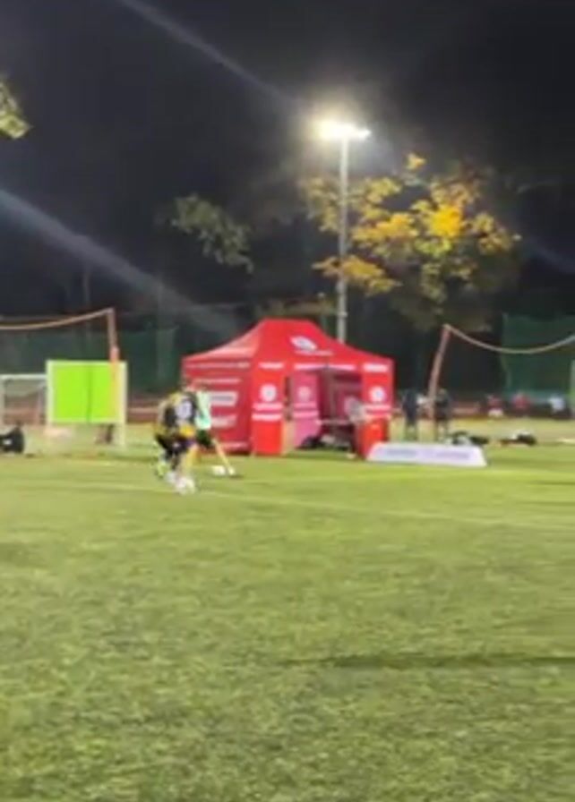nighttime soccer match on a green field illuminated by stadium lights. Several players dressed in yellow and black uniforms are actively playing, while others in green attire watch from the sidelines. A red tent with white branding is set up on one side of the field. The camera follows the players' movements as they pass and kick the ball, with one player executing a high kick. The background includes trees and net fencing, adding depth to the scene.