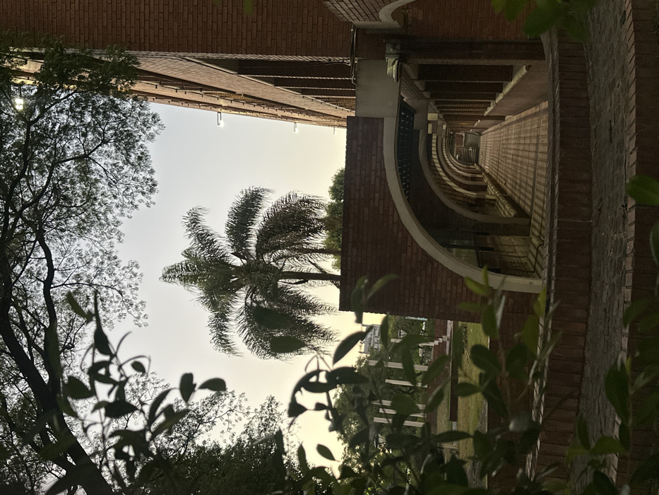 - "An image displays an upward perspective, showcasing a brick building, foliage, and a palm tree against a pale sky" by FM-viVON2, licensed under CC BY 4.0