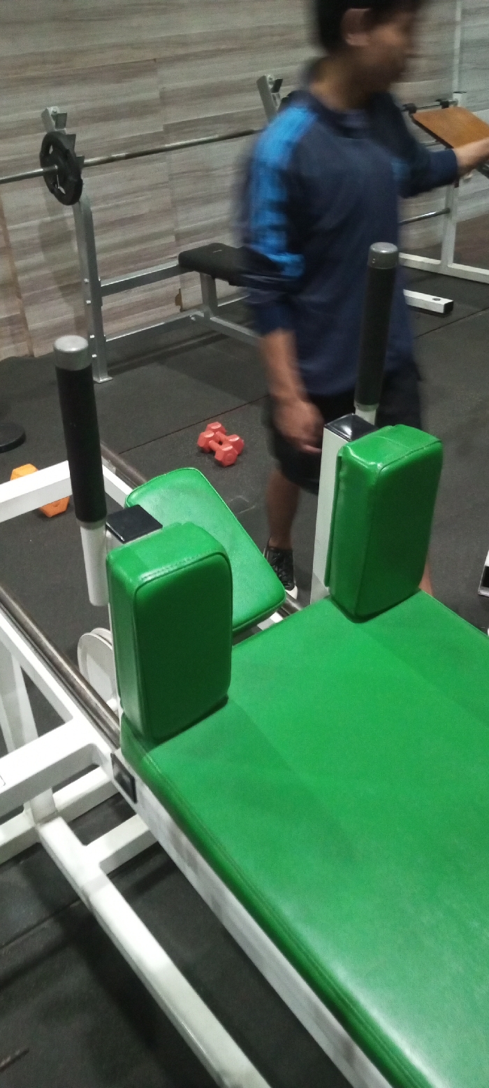 The image depicts the interior of a gym in Aral, Kyrgyzstan. In the foreground, a white-framed leg press machine with prominent green padded seats and backrests is visible. To the right of this machine, a person is in motion, captured with significant blur. The individual wears a dark blue long-sleeved shirt with lighter blue accents on the upper arms and dark shorts, with dark sneakers visible on their feet. Their right arm is slightly bent, positioned towards the front. In the midground, behind the person, a pair of small, red dumbbells rests on the dark rubberized gym floor. To the left of the person, a weight bench with a black pad is situated next to a barbell rack holding a barbell with one black weight plate on the left side. The background features a wall covered with horizontal light-colored, possibly wood-grained, paneling. The floor throughout the visible area is covered in dark gym mats. The scene is illuminated by artificial lighting.