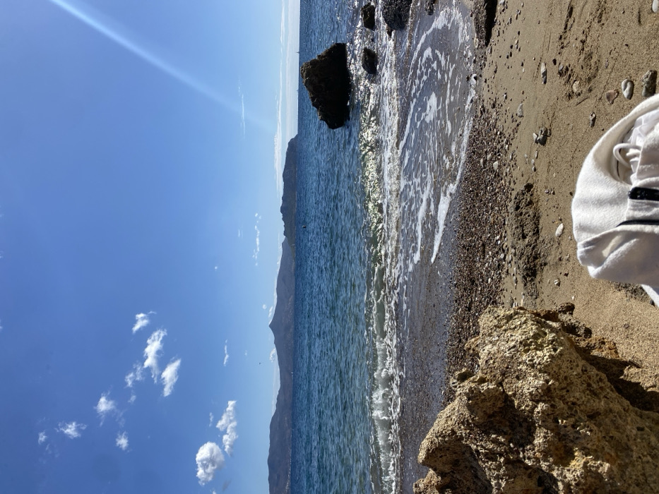 The image depicts a sunlit coastal landscape in the city of Megalochori, Greece. In the immediate foreground, a light brown sandy beach, mixed with small pebbles and darker stones, extends across the lower portion of the frame. A large, textured, light-colored rock is positioned in the lower-left. On the sand in the lower-right, a folded white garment or towel is visible. Small waves with white foam are breaking and receding at the water's edge. The mid-ground consists of clear, blue-green sea water. A distinct, dark rock formation is partially submerged in the water towards the right side. Across the sea, in the background, a range of dark mountains or hills extends along the horizon. The sky above is a vibrant blue with several scattered white cumulus clouds, primarily in the upper-left quadrant. A diagonal lens flare or sunbeam is evident in the upper-right, indicating strong direct sunlight. No individuals or specific actions, beyond the movement of waves, are discernible.