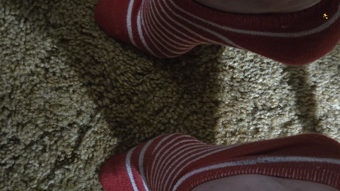 - "Two human feet, clad in identical red ankle socks with thin white horizontal stripes, are positioned on a shaggy, light brown carpet" by FM-0J88a2, licensed under CC BY 4.0