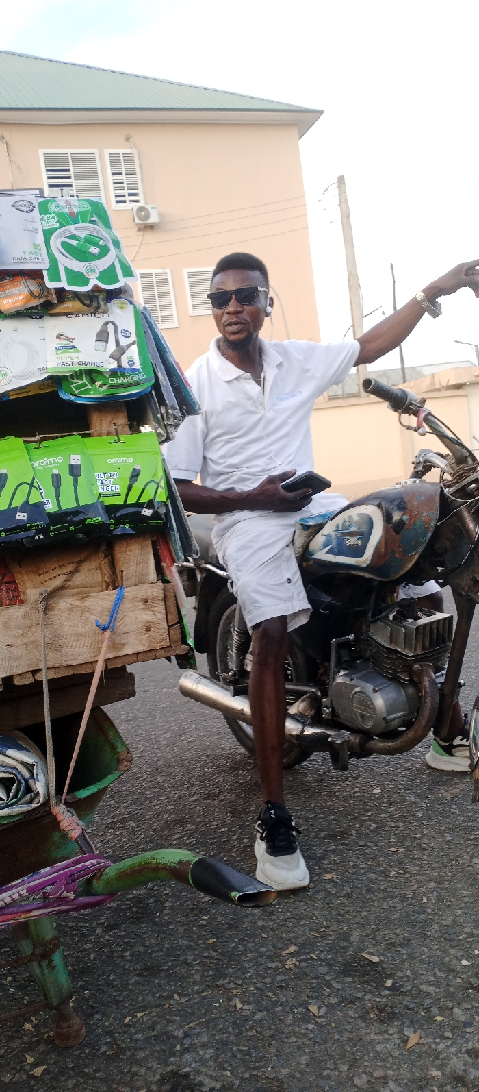 The image captures an outdoor street scene in Lokoja, Nigeria. A male subject is seated on an aged, rusty motorcycle, which has a blue fuel tank marked "Shelby" and a rusted exhaust system. Attached to the left side of the motorcycle is a mobile vending cart, constructed from wood and green-painted metal. This cart displays various electronic accessories, including "Oraimo" and "Carico" brand data cables and fast chargers, visible in their plastic packaging. A rolled tarpaulin is secured beneath the cart. The man wears a white polo shirt, white shorts, black sunglasses, and white sneakers. He has a white earpiece in his right ear and a silver watch on his left wrist. He holds a black smartphone in his left hand, while his right arm is extended, pointing to the right, with his mouth slightly open. In the background, a two-story building with a light-colored facade, a green sloped roof, multiple windows, and an external air conditioning unit is present. A wooden utility pole stands to the right of the man. The ground consists of a dark asphalt road surface. The sky is bright and clear.
