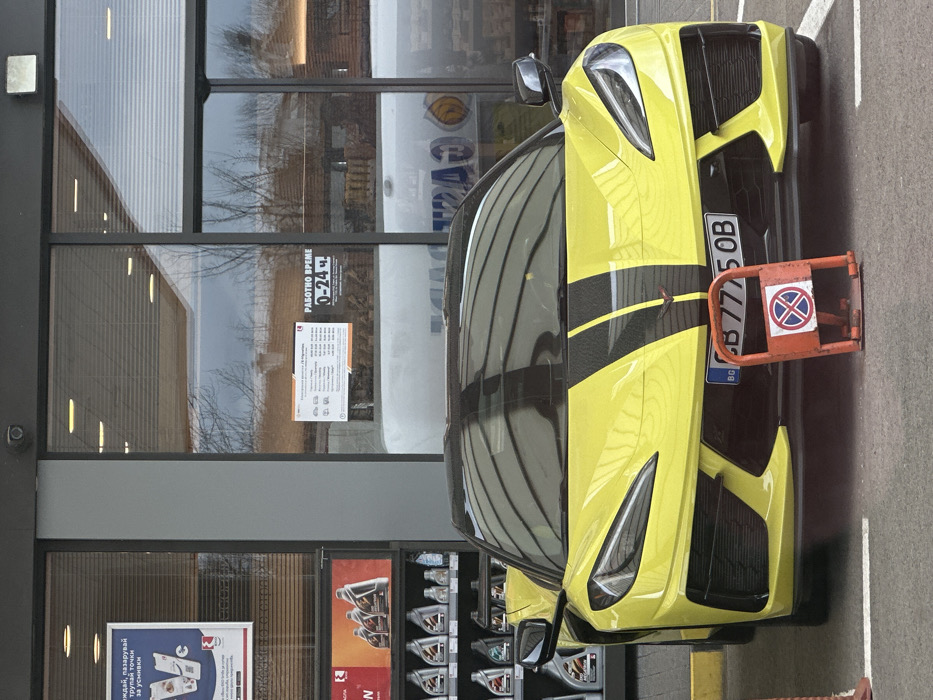 A bright yellow Chevrolet Corvette C8, adorned with two prominent black racing stripes down its hood, is parked outdoors in front of a modern glass-fronted building. The vehicle displays a Bulgarian license plate, "BG 7775 OB," which designates Sofia as its registration city. Positioned directly in front of the car is an orange, folded parking barrier featuring a standard "no stopping or parking" sign. The background building, likely a service station or convenience store, has large windows reflecting bare trees and an overcast sky. Visible through the windows are shelves stocked with items, including bottles of motor oil. Signage affixed to the windows is in Bulgarian; one sign explicitly states "РАБОТНО ВРЕМЕ 0-24 Ч." (Working Hours 0-24 H.), indicating a 24-hour operation, and another poster includes the word "Sofia." A security camera is mounted above the building's glass entrance. No individuals are visible in the scene.