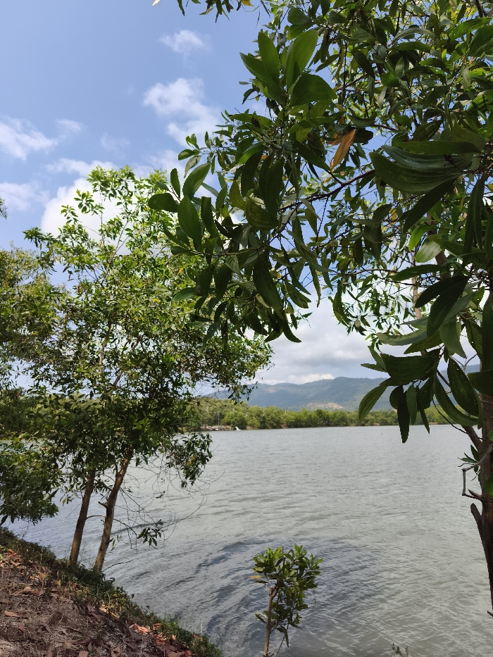 A serene waterscape featuring a body of water, likely a lake, surrounded by lush greenery. Trees with vibrant green leaves frame the scene, partially obscuring the view of distant mountains under a blue sky with scattered clouds. A small sapling grows directly in the water. The water reflects the sky and trees, enhancing the peaceful atmosphere.