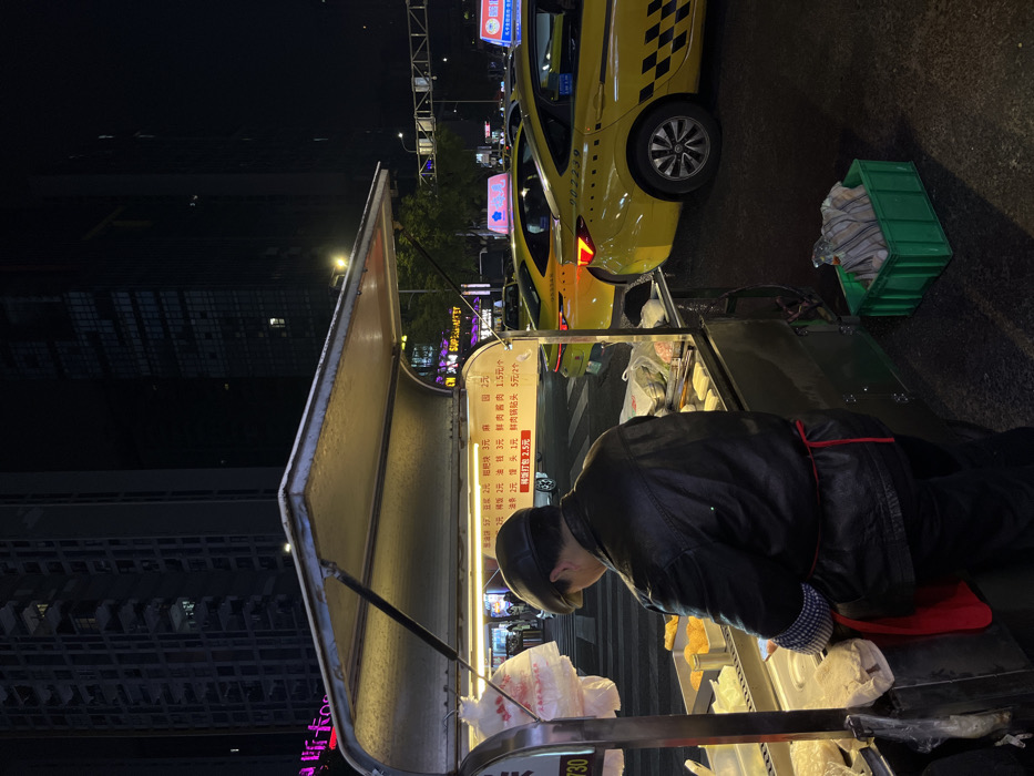 A person stands at a food cart with a menu written in Chinese. The menu lists prices for various items, including "豆成 (soy milk) 2 yuan," "麻园 (sesame cake) 2 yuan," "油条 (fried dough stick) 2 yuan," and "馒头 (steamed bun) 1 yuan." A yellow taxi cab is parked nearby, and a green crate sits next to the cart. The scene is illuminated by streetlights and the cart's own lighting, set against a backdrop of buildings at night.