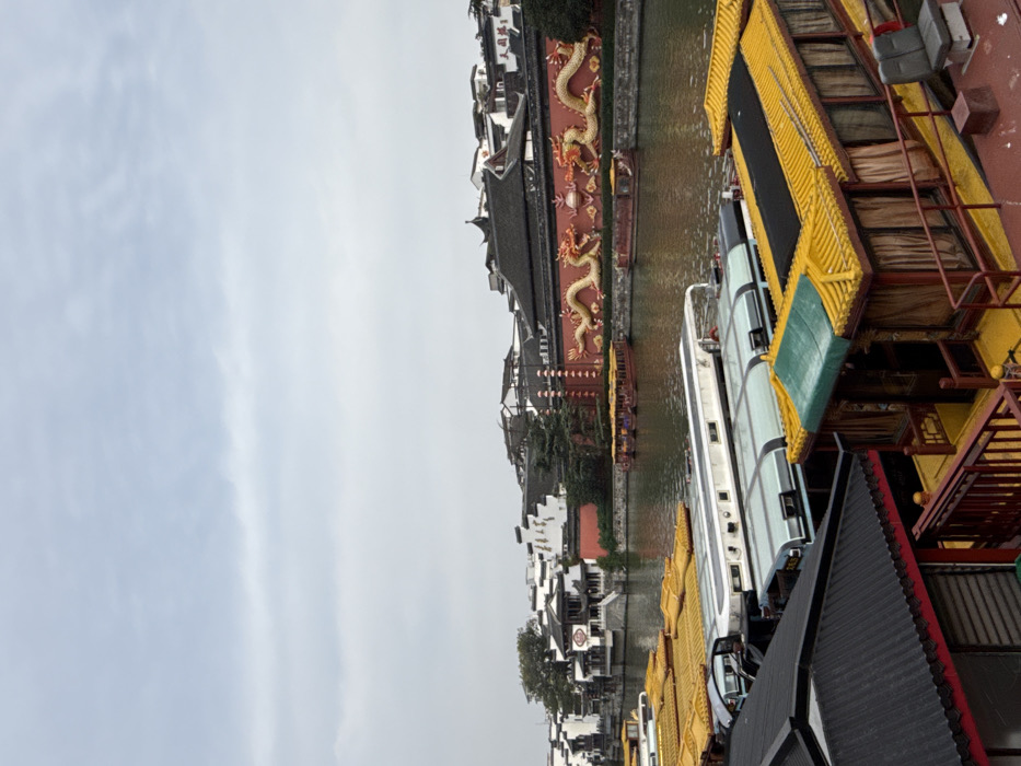 A canal scene depicts docked boats with ornate yellow roofs and dark window panes lining the waterway. Buildings with traditional architecture and a red wall adorned with golden dragon sculptures are visible along the canal's edge. Overcast sky is in the background. The perspective gives a slightly tilted, top-down view.