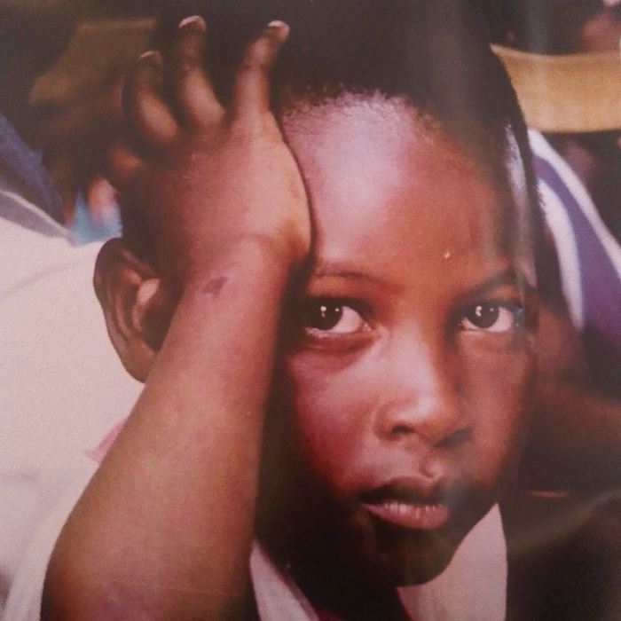 A close-up portrait depicts a young child in Gumel, Nigeria, directly facing the viewer