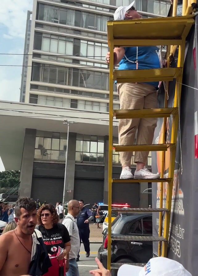 street scene with a group of people, likely at a rally or demonstration. There is a man standing shirtless with a pair of jeans who is yelling with his finger raised. He is talking to a woman in a white baseball cap and sunglasses. Behind them is a yellow metal ladder attached to the side of a black truck. On the ladder is a woman wearing a blue shirt and khaki pants, and a white baseball cap. Behind the ladder is a tall glass-fronted building. Other people are milling about in the background, including some wearing masks. A police car is visible among the parked cars.
