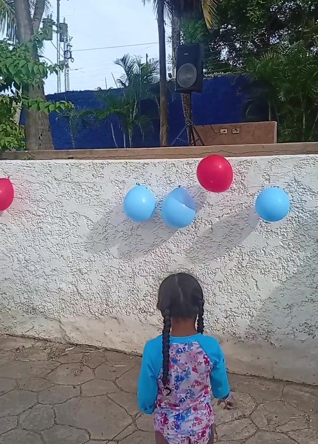 A small girl in a swimsuit is participating in a game with balloons attached to a white textured wall. She's in an outdoor setting, facing the wall, with a woman in an orange shirt beside her. The woman is pointing towards the wall, likely giving direction. The balloons, blue and red, are spread across the wall. The environment includes a tiled ground, a thatched-roof structure behind the wall, trees, and a speaker on a stand.