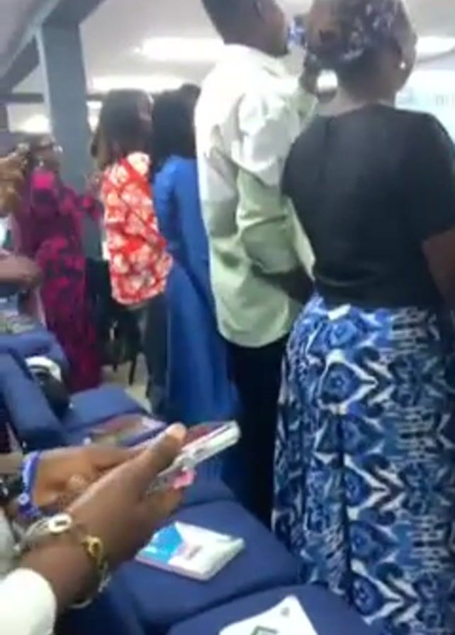 A group of people stand in a brightly lit room, possibly an auditorium, listening to music. Some are seated and facing forward, while others stand facing the same direction. One person is drinking water from a bottle. Some are dressed in colorful patterns, others in solid colors. Several folded pamphlets are visible on seats.