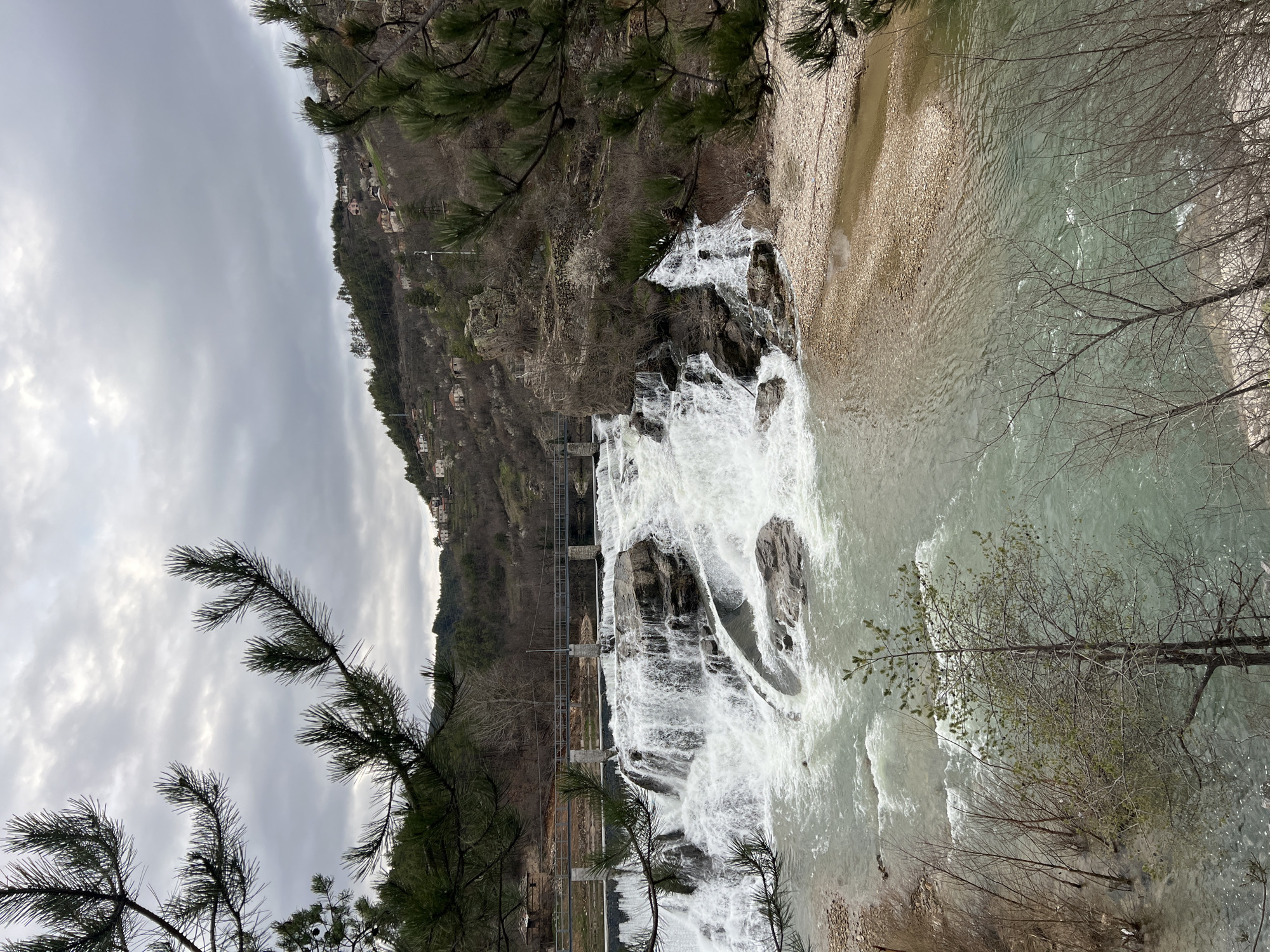 The image depicts a waterfall near Paspal, Bulgaria. The waterfall cascades down a rocky slope, with a bridge structure visible along its path. The water flows into a river, with sandy banks and vegetation present along its edges. A wooded hillside with buildings is visible behind the waterfall. The sky is overcast with grey clouds. Tree branches with pine needles are visible in the foreground on the left side, and bare tree branches are visible on the right side of the scene.