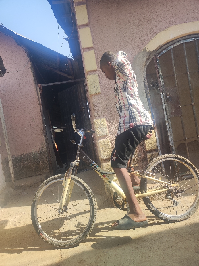 - "An outdoor scene in Akwanga, Nigeria, depicts a young male standing astride a cream-colored, full-suspension mountain bicycle on a light brown, dusty ground surface" by FM-VmtQH2, licensed under CC BY 4.0