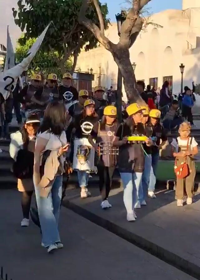 A group of people walks along a street. Most of them wear yellow hard hats and black vests with a white logo and "BATUCADA" written on them. Some members are drumming while others are playing other instruments. The group is on a sidewalk adjacent to a street, lined with a black metal fence. Behind them, there's a white building with a tree providing some shade and a glimpse of a mountain in the distance. Other pedestrians are on the sidewalk too.