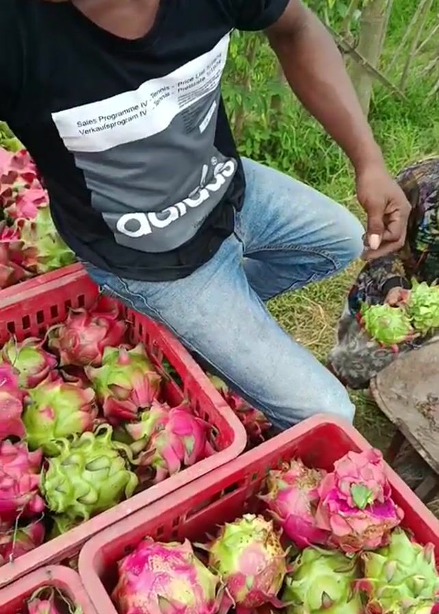 A man in a black t-shirt and jeans is sorting dragon fruit, placing them into red crates. Another person, appearing younger and dressed in a colorful patterned shirt and shorts, is placing dragon fruit into a wheelbarrow. They are outdoors on a grassy area with vegetation in the background. The camera is positioned to show the crates of dragon fruit in the foreground and the individuals working with them. The man carefully picks up the fruit and hands them to the other person.