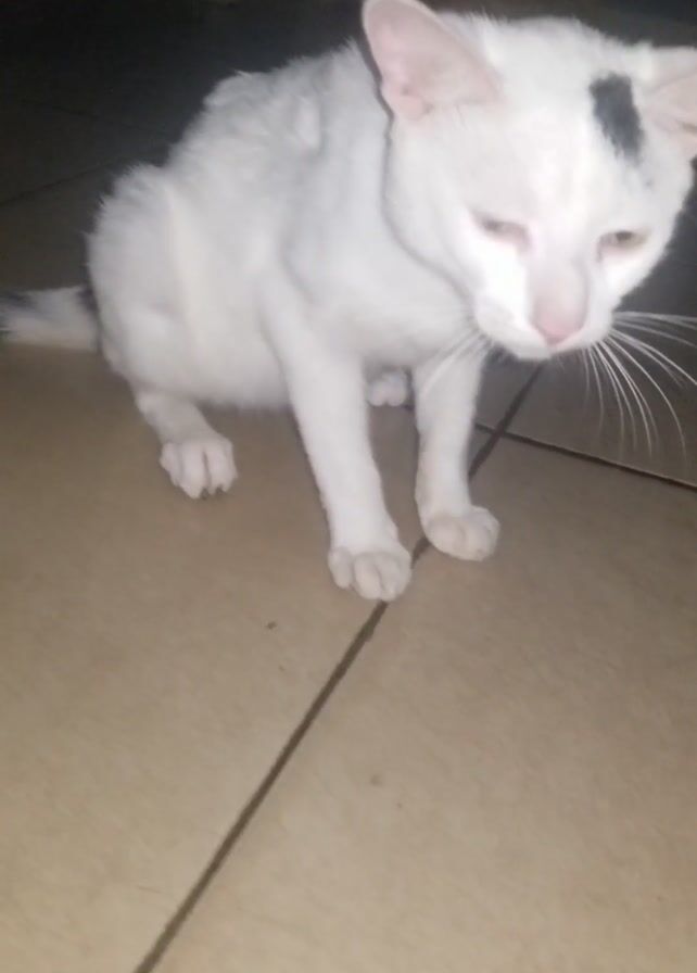 A white cat with a black spot on its head is standing on a tiled floor. The cat is looking up and to the right, with its front paws outstretched. It appears to be reaching for something out of frame. The floor tiles are a light beige color and have dark grout lines. The lighting is dim. The camera is positioned above the cat, looking down.