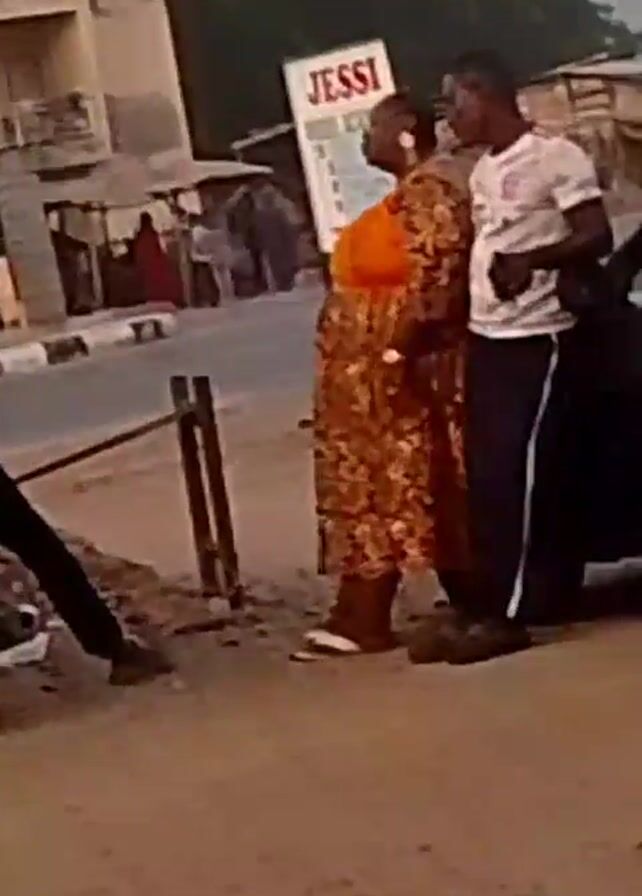 street scene with several people and vehicles. A man is straddling a parked motorcycle on a dirt area next to the road. Next to him, a woman in a yellow-patterned dress and a man in a white shirt are standing and talking. There's a sign that says "JESSI" visible in the background. A yellow tuk-tuk and a black car pass on the road behind them. Other people can be seen walking in the background.