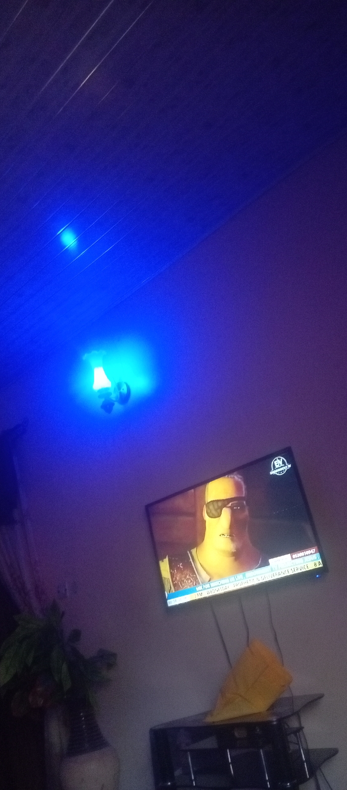 A darkly lit room features a blue ceiling light and a wall-mounted television. The screen displays a man with sunglasses, possibly from a movie or show, alongside television broadcast text. A potted plant sits to the left of the screen, while a black television stand supports a yellow object. The overall ambiance is a cool, dim blue.