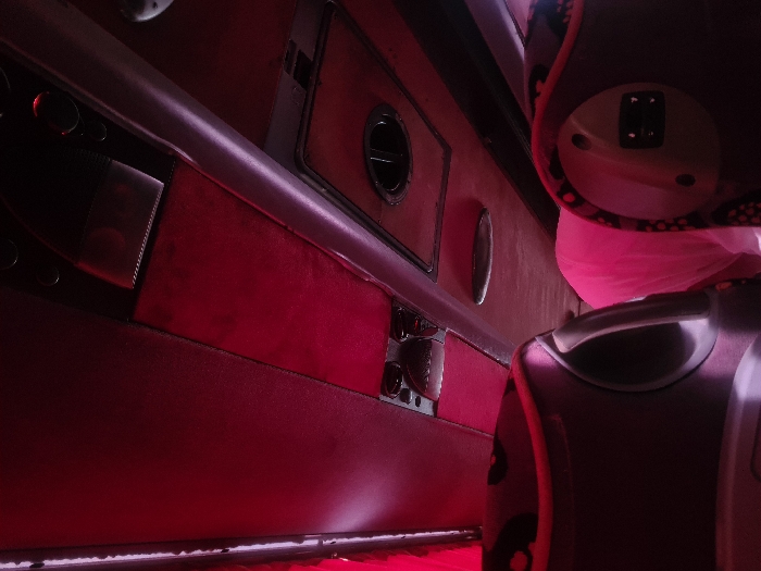The image displays the interior of a passenger transport vehicle, likely a bus or coach, illuminated by a dominant red/magenta ambient light source, possibly LED strips visible on the left ceiling edge