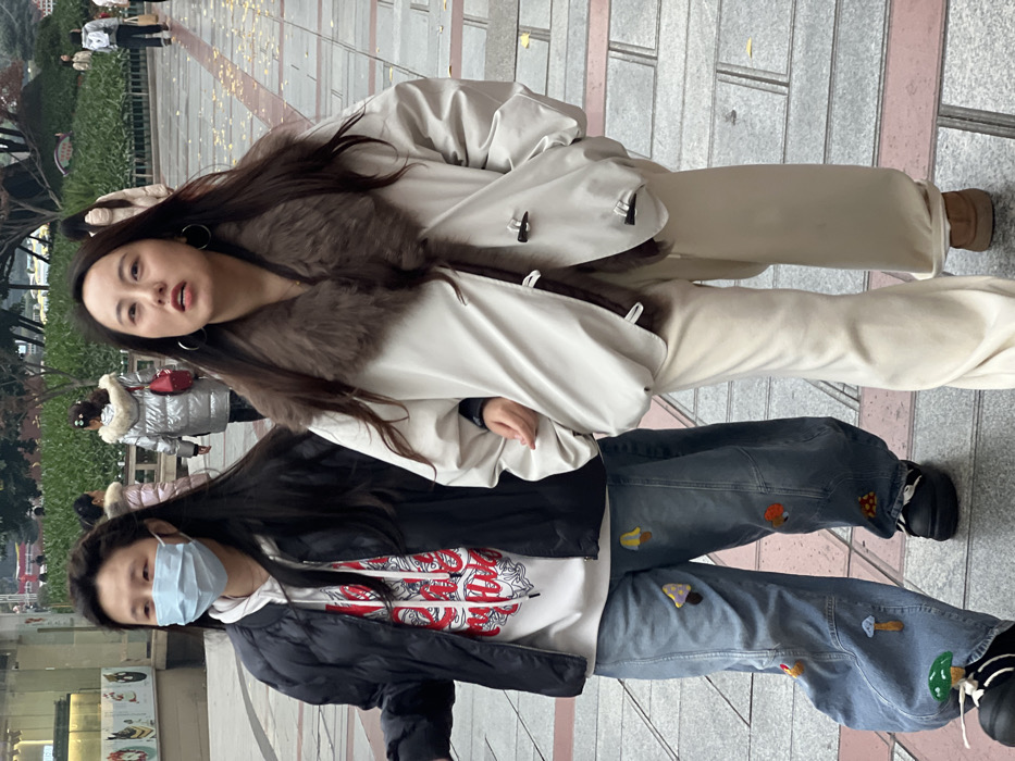 The image captures two East Asian females walking on a paved sidewalk in Shapingba District, China