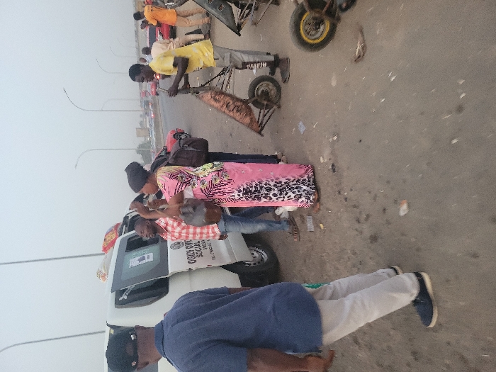 On a busy road, a group of people gathers near a white van. Luggage and personal belongings are piled on top of the vehicle. A man in a yellow shirt uses a hand cart to transport an item. Several individuals stand around, interacting, while another person walks in the foreground. The scene suggests a roadside stop during travel.