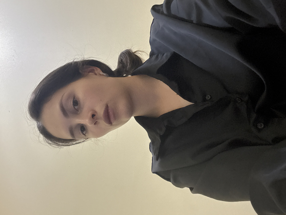 The scene is an indoor portrait captured in Al Jimi, United Arab Emirates. A single female subject, with dark hair gathered into a low bun, is depicted from a low camera angle, looking directly at the viewer. She is wearing a black, collared, button-front shirt. A small dark object is visible in her right nostril, and a metallic earring is present in her right ear. The background consists of a plain, uniformly lit, light cream-colored wall. No other individuals, objects, actions, or environmental details are discernible.