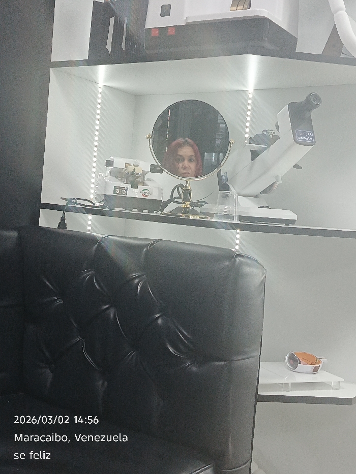 An interior scene in Maracaibo, Venezuela, features a display of optical equipment and a partial view of a black tufted chair in the foreground