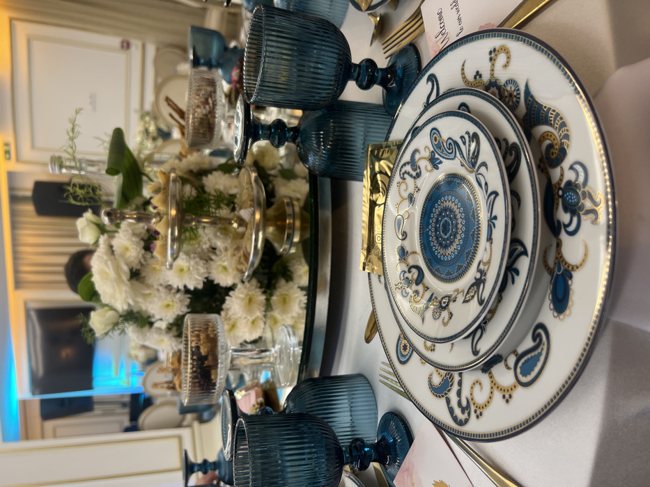 The image displays an elegantly arranged table setting within an indoor event space. In the foreground, a place setting on a white tablecloth features three stacked white porcelain plates with intricate blue and gold paisley and medallion patterns. Gold-toned flatware, including a fork, is positioned to the left and right. Two blue-tinted, ribbed glass goblets are visible, one upright and one inverted. A small pink card, partially obscured, reads "Welcome to our wedding," and a small golden rectangular object rests near the top plate. The midground is dominated by a centerpiece on a round mirrored tray. This centerpiece includes a large arrangement of white chrysanthemums and white roses with green foliage. A two-tiered metallic stand on the mirrored tray holds small pastries. Two ribbed clear glass bowls contain nuts or dried fruits, and a clear glass bottle is also present. The background, out of focus, reveals a spacious interior with light-colored walls, gold-toned architectural trim, and soft blue accent lighting. A person's head is partially visible behind the floral arrangement, and black loudspeakers are discernible, indicating an event setting. While the event is set up for a celebration, no specific actions or interactions are currently occurring. The exact location within the city of Tangier, Morocco, is not visually identifiable from the image content alone; the setting is that of a generic, upscale banquet or event hall.