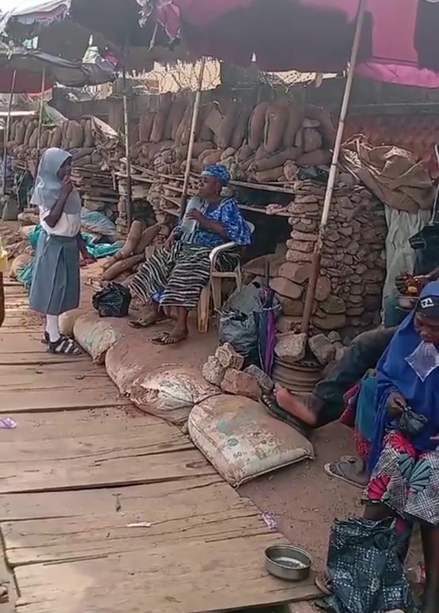 market scene with various individuals and items. An elderly woman in a blue patterned top and a striped skirt is seated on a chair, while a young girl in a school uniform stands next to her. Another woman wearing a blue hijab and a red and black patterned skirt sits on the ground, pouring food from a bowl into a bag. Several other people, including a boy in a yellow shirt and a group of men, are present in the background, some eating. The market stalls are shaded by umbrellas, and there are various items for sale, including what appear to be yams stacked behind the seated woman. The ground is a mix of dirt and wooden planks, with a drain visible in the foreground. There are also sacks, buckets, and other miscellaneous items scattered around the area. A wall topped with barbed wire is visible in the background.