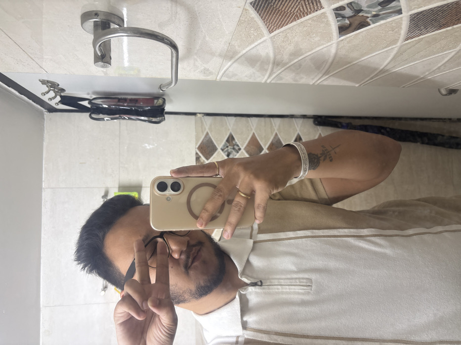 The image displays a male individual taking a mirror selfie within a private bathroom setting. The subject, seen from the chest up, has short dark hair, a beard, and wears dark-framed eyeglasses. He is clad in a short-sleeved polo shirt, primarily off-white with vertical beige stripes and a zippered placket. His left hand is raised, forming a "V" sign, partially obscuring his face. His right hand holds a gold-colored iPhone, encased in a clear cover with a visible MagSafe ring, indicating the device used to capture the reflection. On his right hand, he wears two simple rings, and on his right wrist, a silver-colored patterned bracelet. A tattoo depicting a stylized rose with a cross beneath it is visible on his right forearm. The background features tiled walls. The upper wall section behind the subject consists of light-colored, possibly off-white, square tiles. To the right, a decorative section of the wall displays geometric tiles in shades of brown, beige, and white. A silver-colored metal towel ring is affixed to the wall on the right, and above it, a multi-hook hanger with a dark pouch suspended from one hook is present. The lighting is bright and uniform. No specific landmarks or distinguishing features are visible to pinpoint an exact location within Kolkata, India; it appears to be a typical residential or private establishment bathroom.
