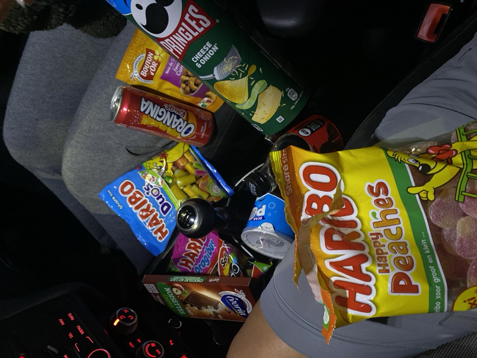 The image depicts the interior of a vehicle, specifically focusing on the central console and passenger leg area, filled with various snack items and beverages. The scene is set inside a vehicle; while the prompt specifies Mouscron, Belgium, no visual information within the image confirms a precise location within that city. Two individuals are present, evidenced by their legs. In the foreground, a person's legs, wearing grey shorts or sweatpants, hold an open yellow "Haribo Happy Peaches" share-size bag on their lap. Visible on the passenger side are another person's legs, clad in grey sweatpants. The central console area is occupied by several items: * A manual gear stick with a black knob and silver trim. * A brown "Vovla" milk chocolate bar with hazelnuts, standing upright. * A blue bag of "HARIBO Duos" gummy candies. * A partially obscured pink bag labeled "HARIBO Dragibus Soft." * A red "Orangina Rouge" beverage can. * A large green cylindrical can of "Pringles Cheese & Onion" potato chips. * A yellow "Bouton d'Or" snack bag, identified as "Noix de cajou Saveur Curry" (curry flavored cashews). * A partially obscured blue and white can, possibly a beverage, positioned near the gear stick. * A small dark bottle, partially visible, with a red label. Portions of the vehicle's dashboard are visible in the upper left, featuring red illuminated controls, suggesting low-light conditions, possibly nighttime or dusk. The items are arranged for easy access, indicating a probable car journey or parked snack break. The Haribo Happy Peaches bag is open, suggesting recent or active consumption.